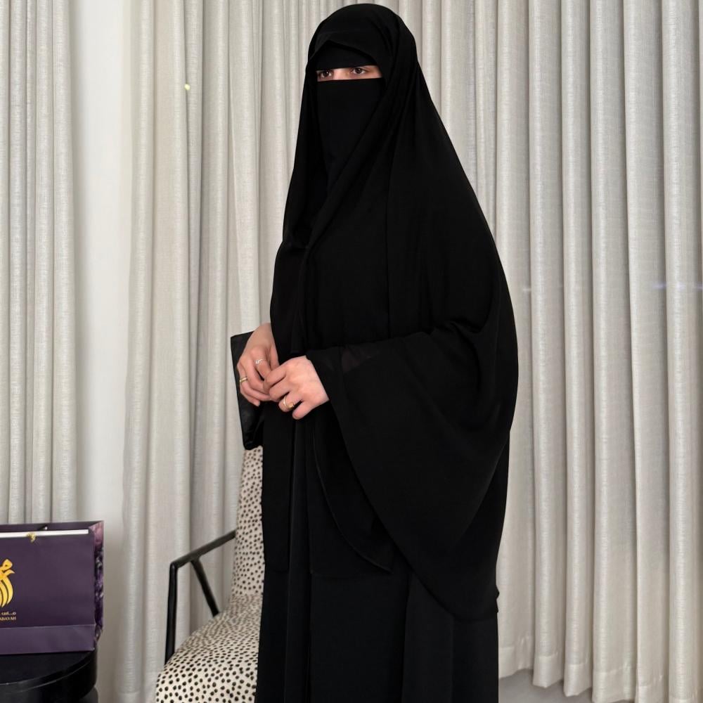 خمار نسف بدون أكمام مع مطاط مثبت على الراس وطقطق من الامام بقماش الشيلة الملكية الكوري ثابت واسود وعملي للاستخدام اليومي
