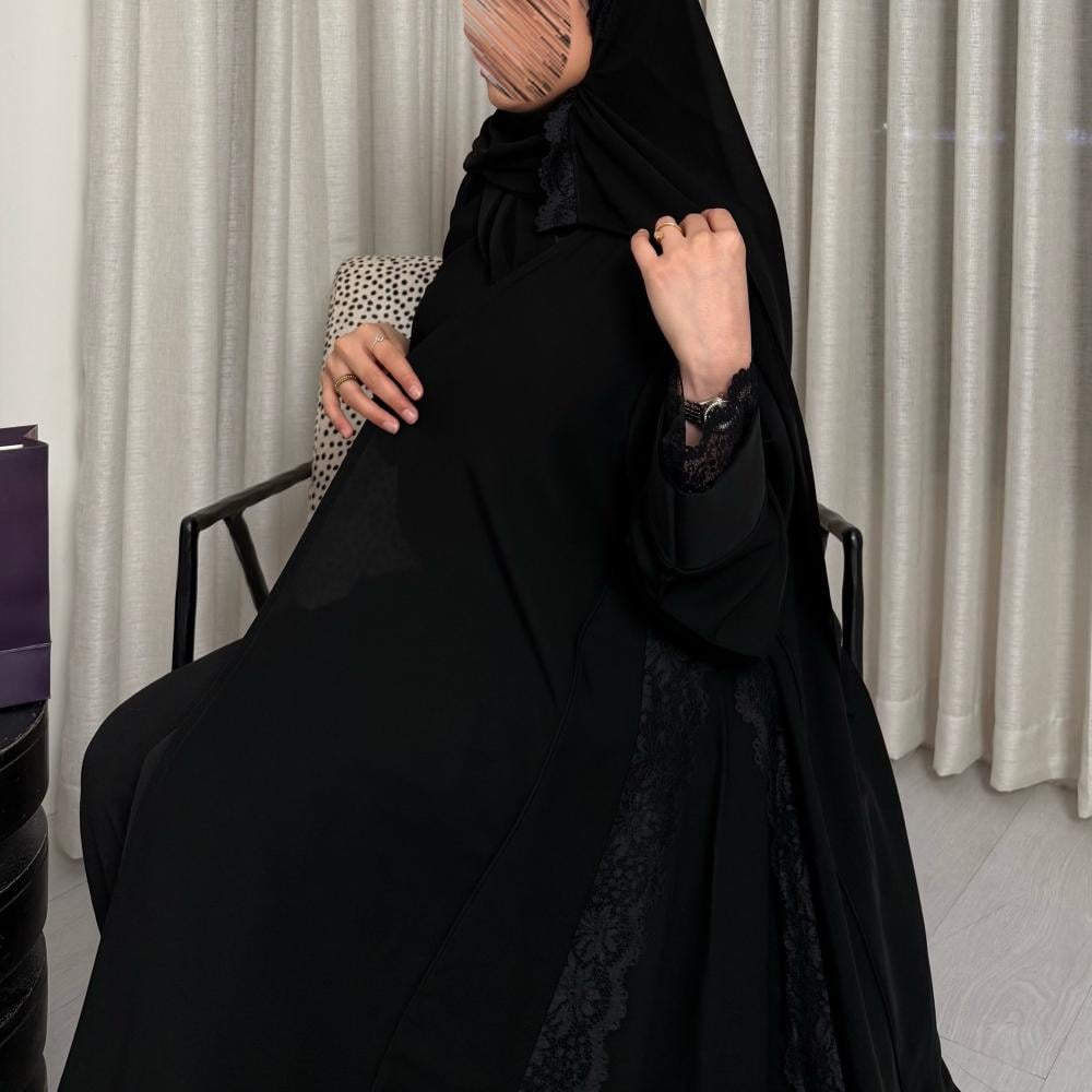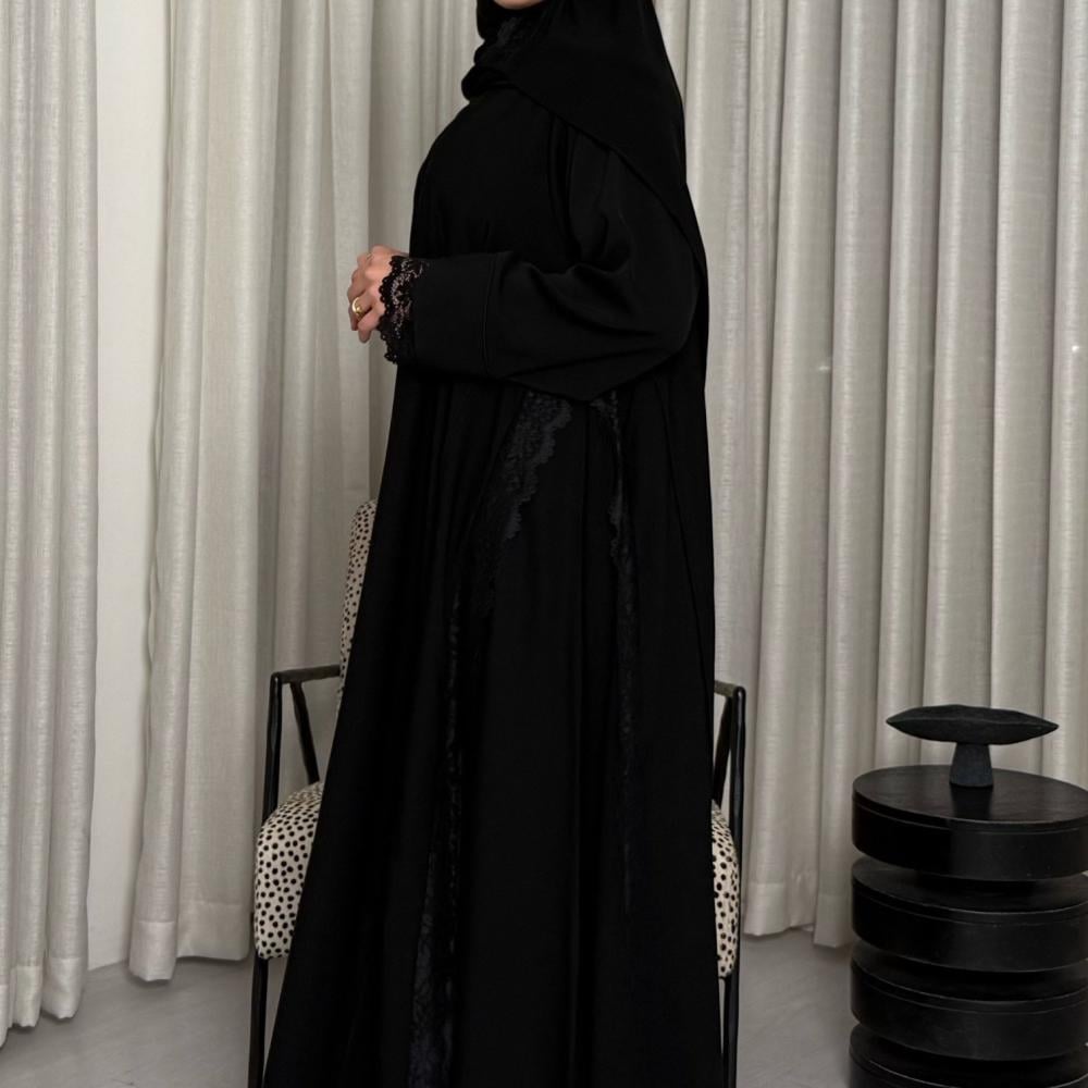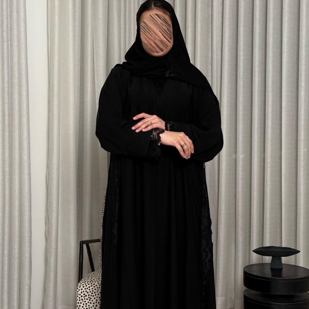 - طرف دانتيل أسود يبرز جمال العباية بشكل مذهل.