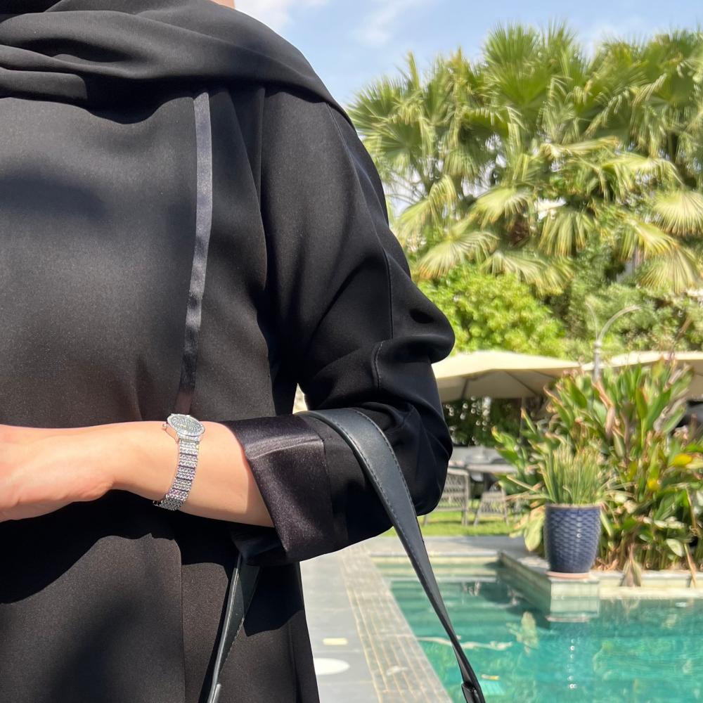 - تفاصيل ستان أسود تضفي لمسة من الفخامة والرقي.