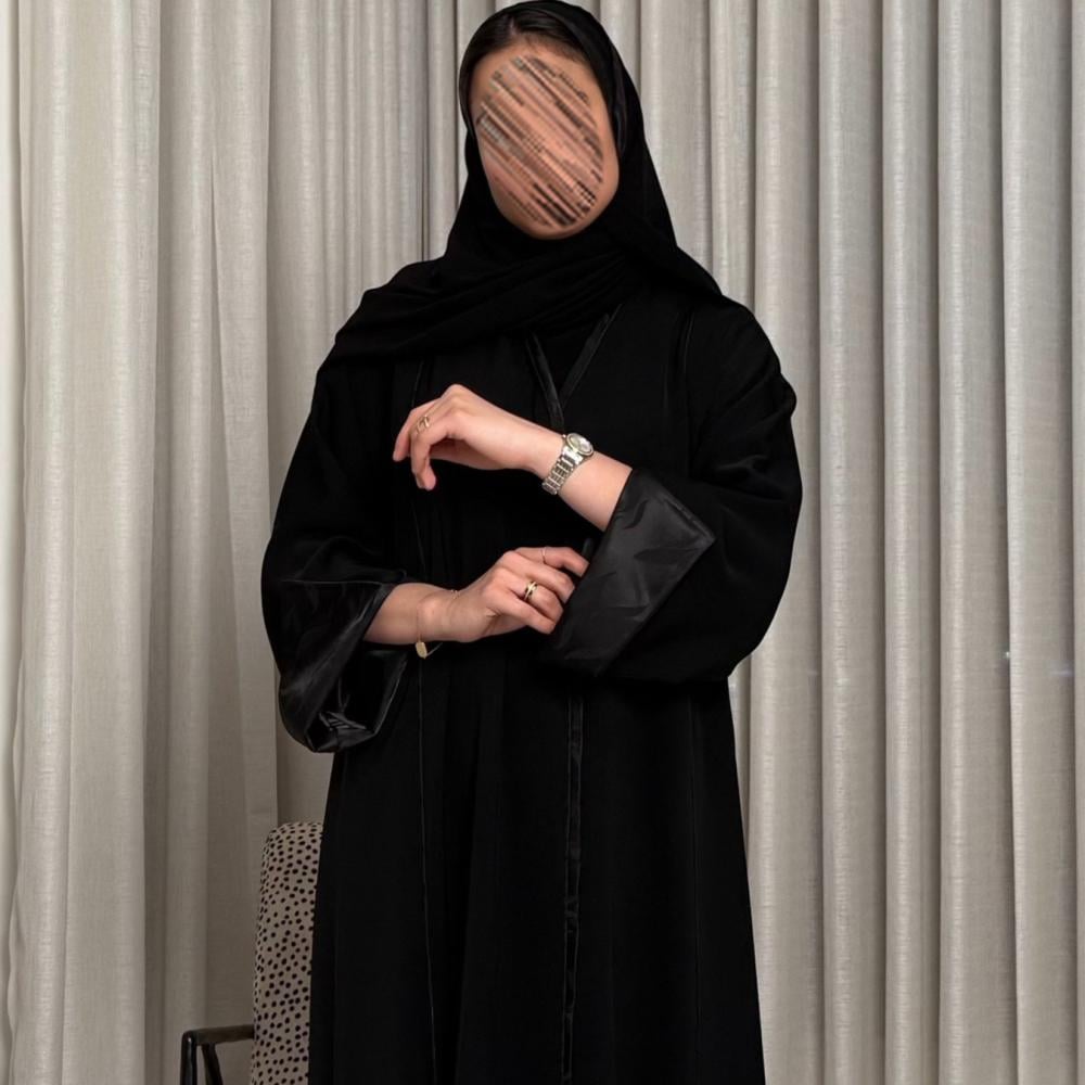عباية سوداء واسعة خفيفة مزينه بقيطان بقصة طوليه إثنين من الامام وإثنين من الخلف من قماش جاكار ستان لمظهر انيق وانسيابي رائع والكم مبطن من الداخل بالكامل بتصميم جاكار رائع و أنيق القصة نص كلوش بقماش كوري فخم يتميز بملمس ناعم وراحة لا مثيل لها كما أنها لا تحتاج إلى الكي خفيفة اللمعة وغير شفافة ومثالية لأيام الصيف تألقي بأناقتك وراحة لا تُنسى احصلي علي ميهاف من ماس عبايه